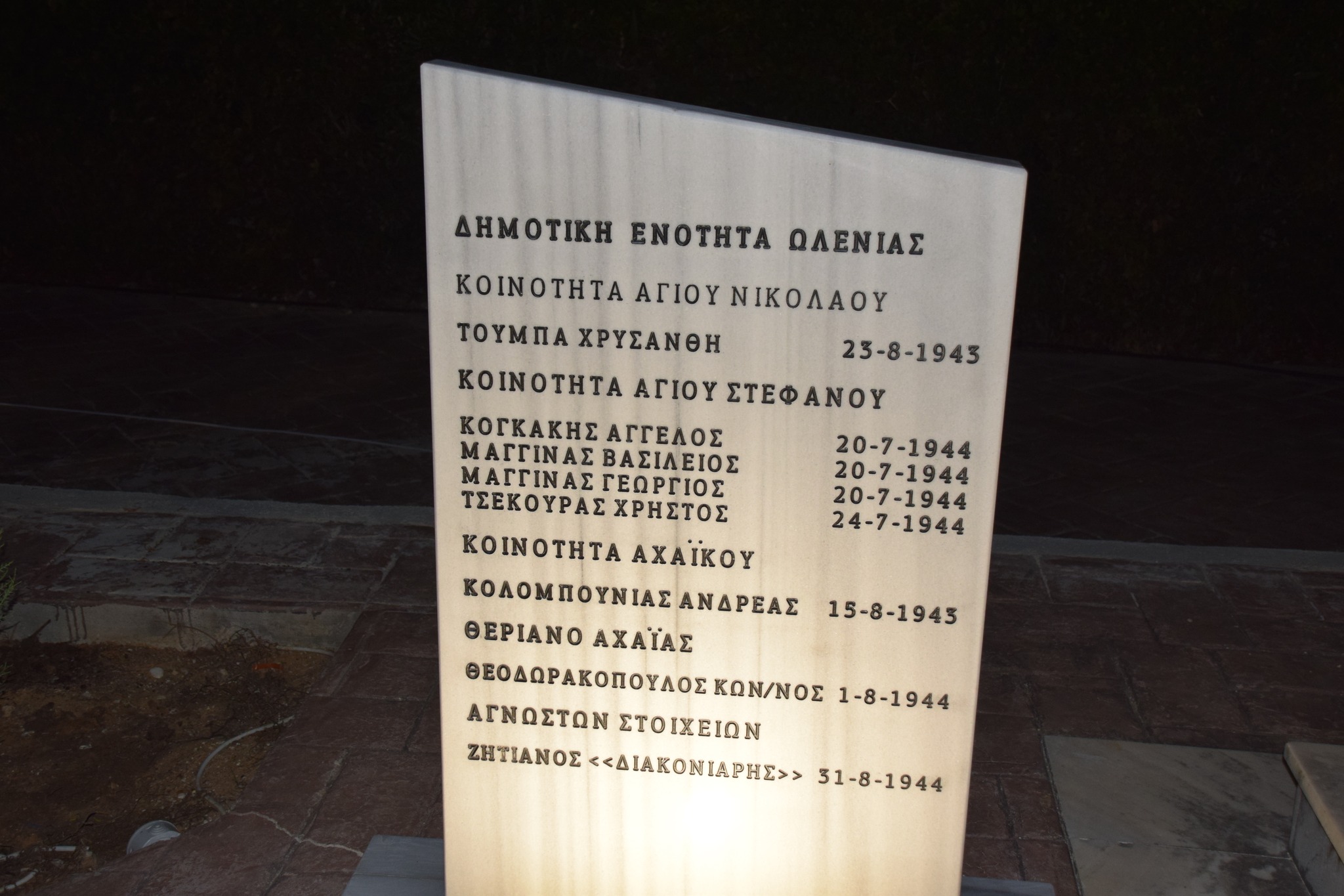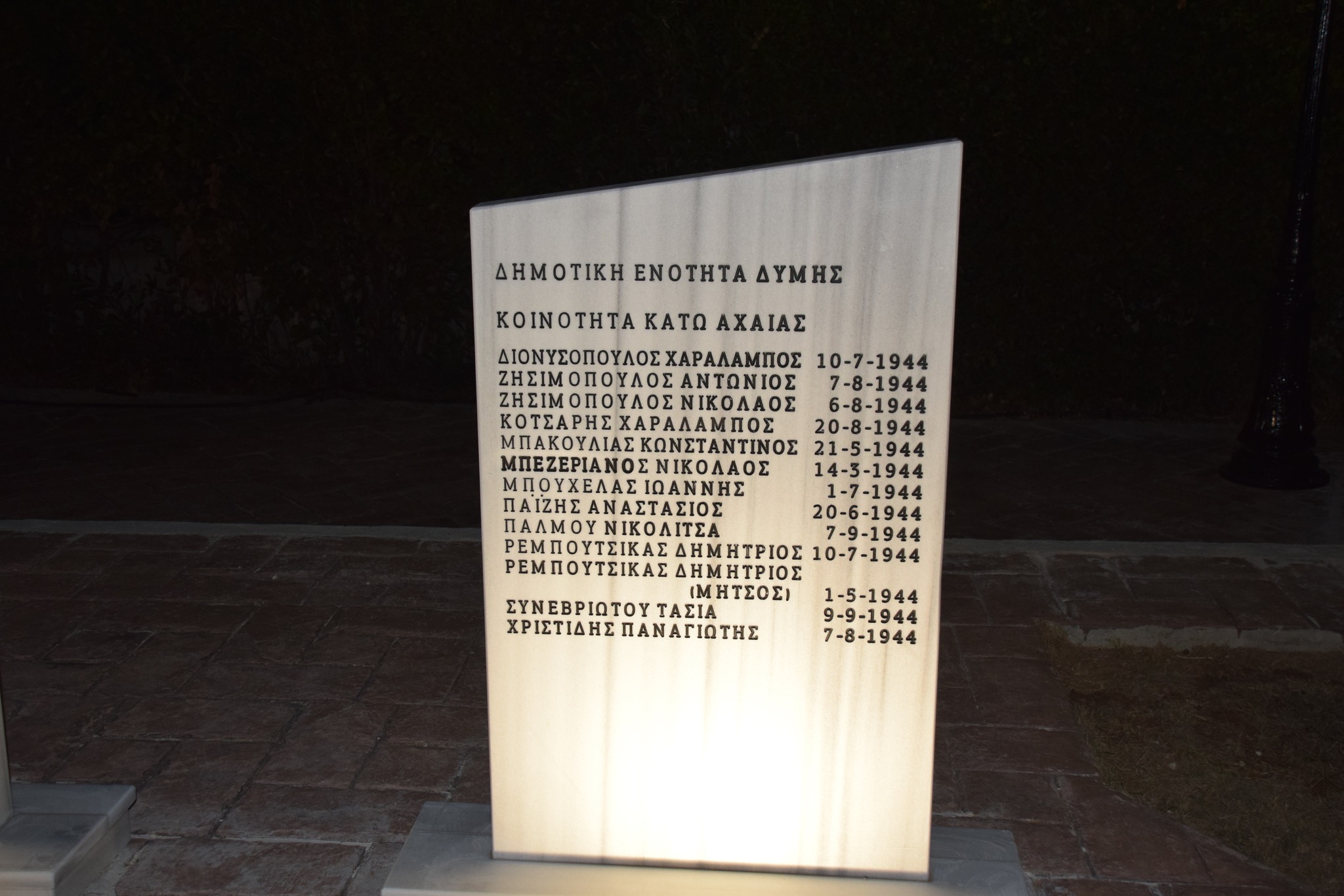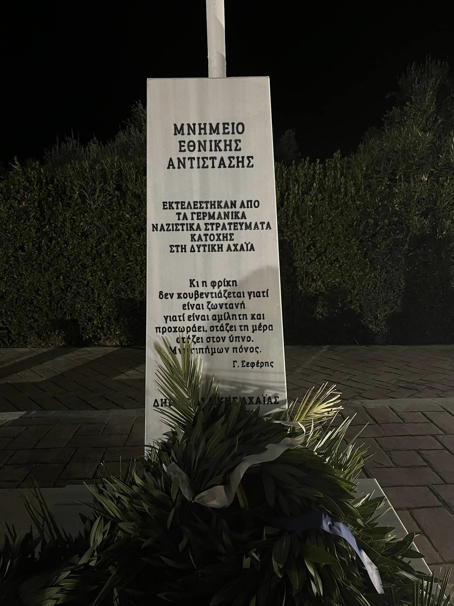 Πρόκειται για ένα επιβλητικό μνημείο στην μνήμη των κατοίκων της Δυτικής Αχαΐας που εκτελέστηκαν από τα γερμανικά στρατεύματα κατοχής κατά την περίοδο 1941 – 1944. Αποτελείται από επτά μαρμάρινες στήλες στις οποίες αναγράφονται τα ονόματα των πεσόντων ανά δημοτική ενότητα, ενώ ταυτόχρονα στο κέντρο της σύνθεσης ξεχωρίζει περίοπτη μια στήλη με χαραγμένους τους στίχους του βραβευθέντα με Νόμπελ ποιητή Γιώργου Σεφέρη.