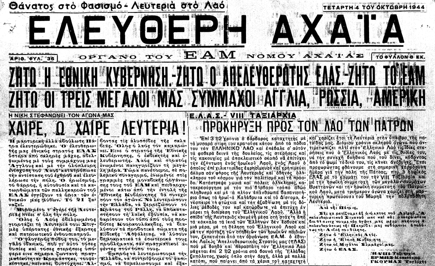 Με αυτήν την περιγραφή, γεμάτη έντονη συναισθηματική φόρτιση, εφημερίδα της εποχής ανακοινώνει την απελευθέρωση της πόλης της Πάτρας από τα γερμανικά στρατεύματα κατοχής, την Τετάρτη 4 Οκτωβρίου 1944.