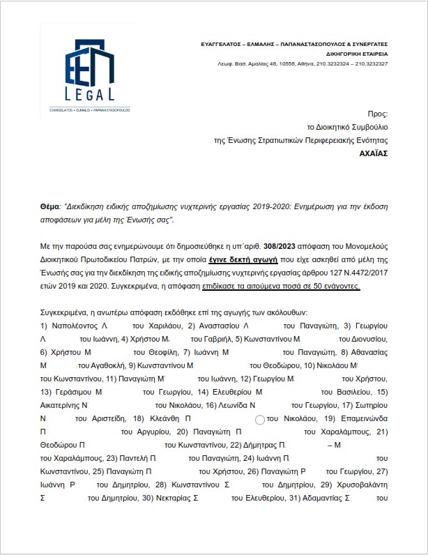 Η Ένωση Στρατιωτικών Περιφερειακής Ενότητας Αχαΐας (Ε.Σ.Π.Ε.ΑΧ.) σας ενημερώνει ότι με την απόφαση 308/2023 του Μονομελούς Διοικητικού Πρωτοδικείου Πατρών έχουν γίνει δεκτές οι αγωγές των συναδέλφων μας αναφορικά με την αποζημίωση νυκτερινής εργασίας τους για τα έτη 2019 και 2020. Μάλιστα, η αποζημίωση είναι προσαυξημένη με το επιπλέον ποσό των 150€ ως ηθική βλάβη.
