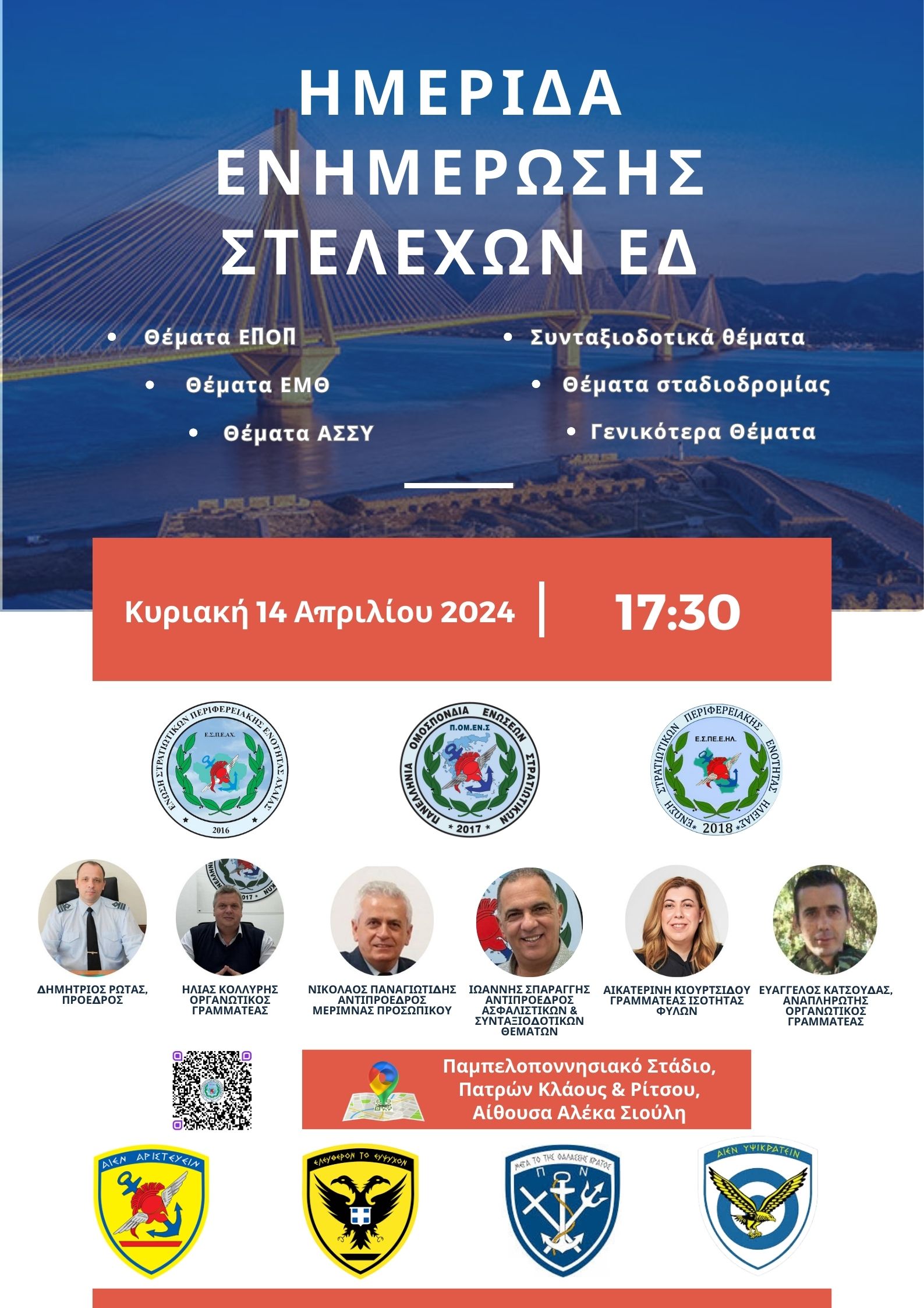 Την ίδια ημέρα και στην ίδια αίθουσα η Ε.Σ.Π.Ε.ΑΧ., από κοινού με την Ένωση Στρατιωτικών Περιφερειακής Ενότητας Ηλείας (Ε.Σ.Π.Ε.ΗΛ.) και με τη συνεργασία της Πανελλήνιας Ομοσπονδίας Ενώσεων Στρατιωτικών (Π.ΟΜ.ΕΝ.Σ.), διοργανώνει ημερίδα ενημέρωσης των Στελεχών των Ενόπλων Δυνάμεων. Στην ημερίδα μπορούν να συμμετέχουν όλες και όλοι οι συνάδελφοι που υπηρετούν σε Μονάδες των Περιφερειακών Ενοτήτων Αχαΐας και Ηλείας, ανεξάρτητα από το αν αποτελούν εγγεγραμμένα μέλη των Ε.Σ.Π.Ε.ΑΧ. και Ε.Σ.Π.Ε.ΗΛ.